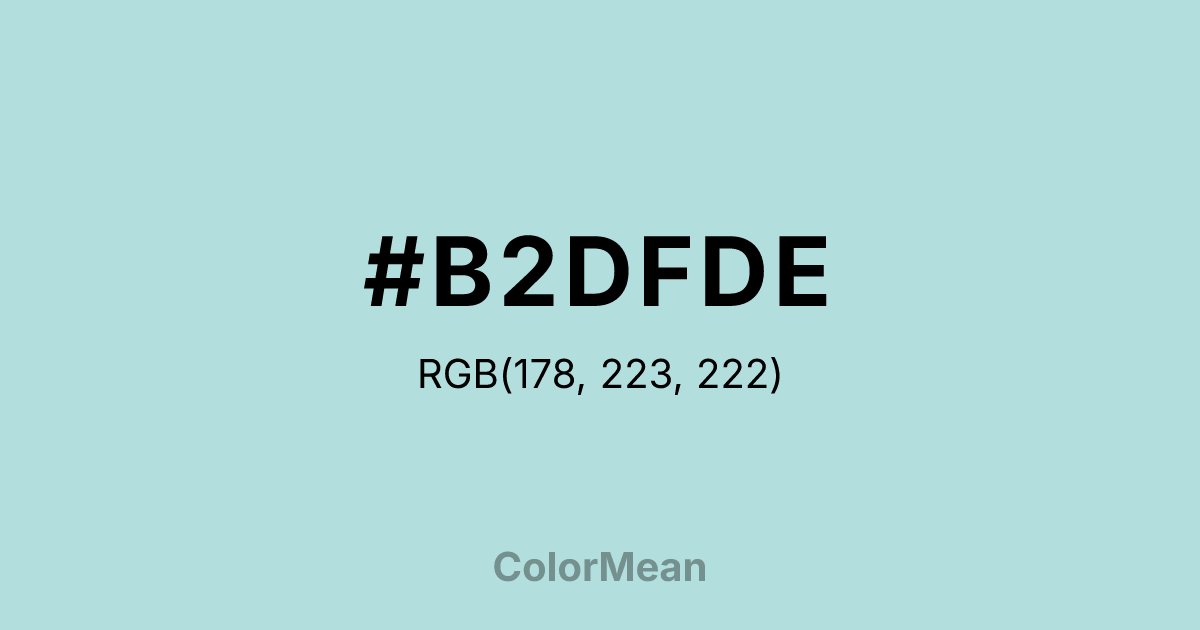 #B2DFDE RGB value is (178, 223, 222). The hex color red value is 178, green is 223, and blue is 222. Its HSL format shows a hue of 179°, saturation of 41 percent, and lightness of 79 percent. The CMYK process values are 20 percent, 0 percent, 0 percent, 13 percent.