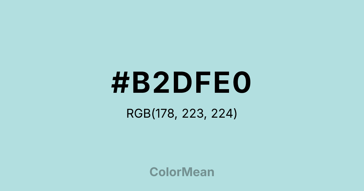 #B2DFE0 RGB value is (178, 223, 224). The hex color red value is 178, green is 223, and blue is 224. Its HSL format shows a hue of 181°, saturation of 43 percent, and lightness of 79 percent. The CMYK process values are 21 percent, 0 percent, 0 percent, 12 percent.