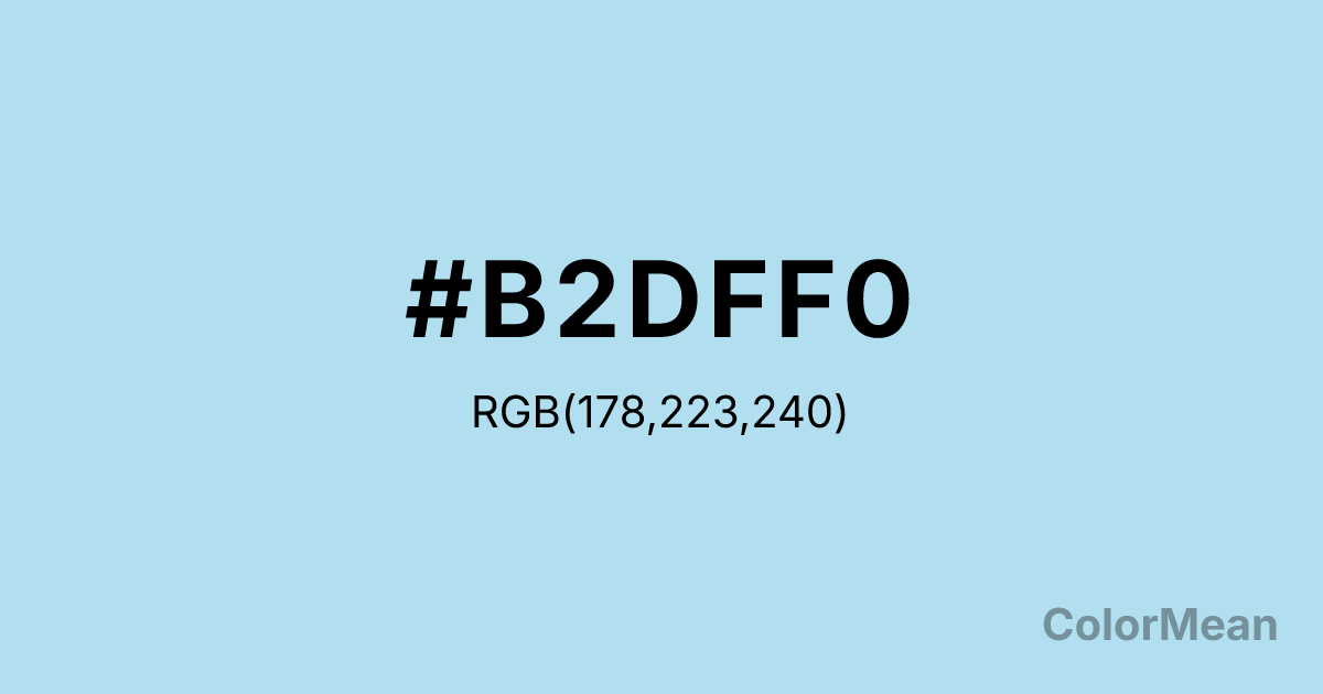 #B2DFF0 RGB value is (178, 223, 240). The hex color red value is 178, green is 223, and blue is 240. Its HSL format shows a hue of 196°, saturation of 67 percent, and lightness of 82 percent. The CMYK process values are 26 percent, 7 percent, 0 percent, 6 percent.