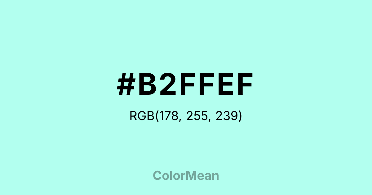 #B2FFEF RGB value is (178, 255, 239). The hex color red value is 178, green is 255, and blue is 239. Its HSL format shows a hue of 168°, saturation of 100 percent, and lightness of 85 percent. The CMYK process values are 30 percent, 0 percent, 6 percent, 0 percent.