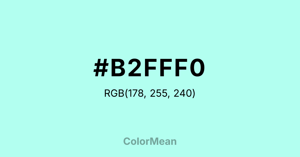 #B2FFF0 RGB value is (178, 255, 240). The hex color red value is 178, green is 255, and blue is 240. Its HSL format shows a hue of 168°, saturation of 100 percent, and lightness of 85 percent. The CMYK process values are 30 percent, 0 percent, 6 percent, 0 percent.