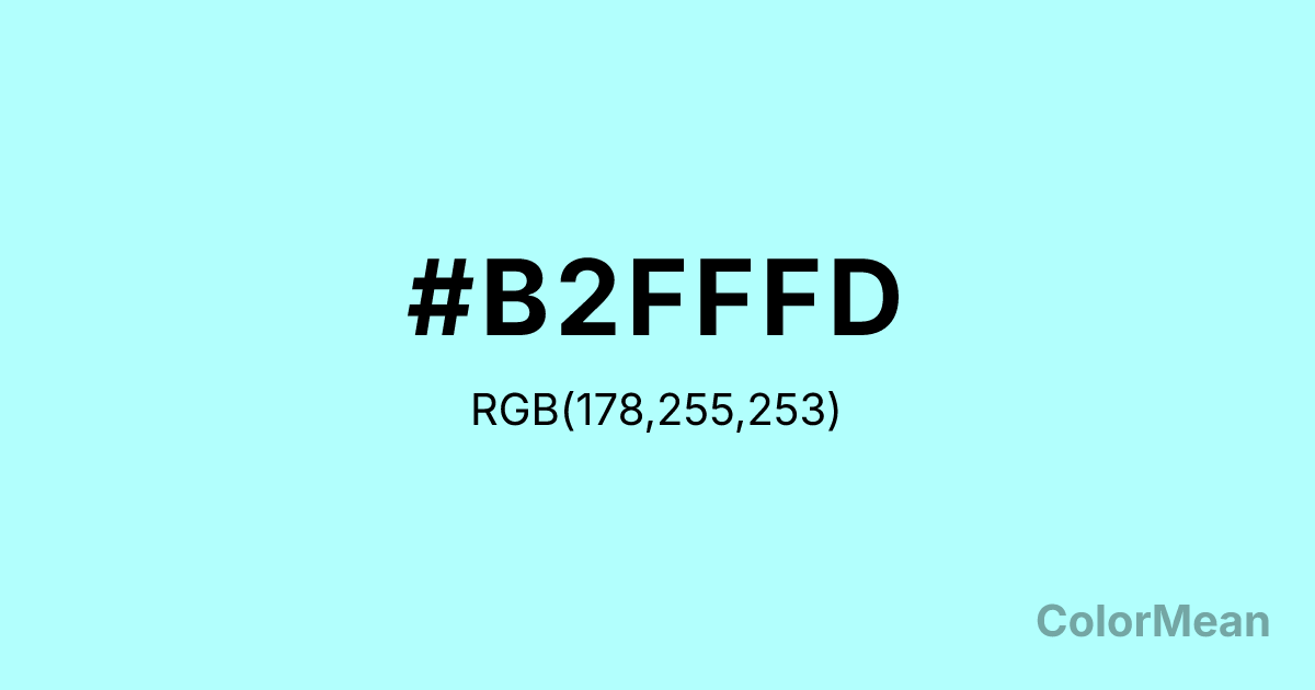 #B2FFFD RGB value is (178, 255, 253). The hex color red value is 178, green is 255, and blue is 253. Its HSL format shows a hue of 178°, saturation of 100 percent, and lightness of 85 percent. The CMYK process values are 30 percent, 0 percent, 1 percent, 0 percent.