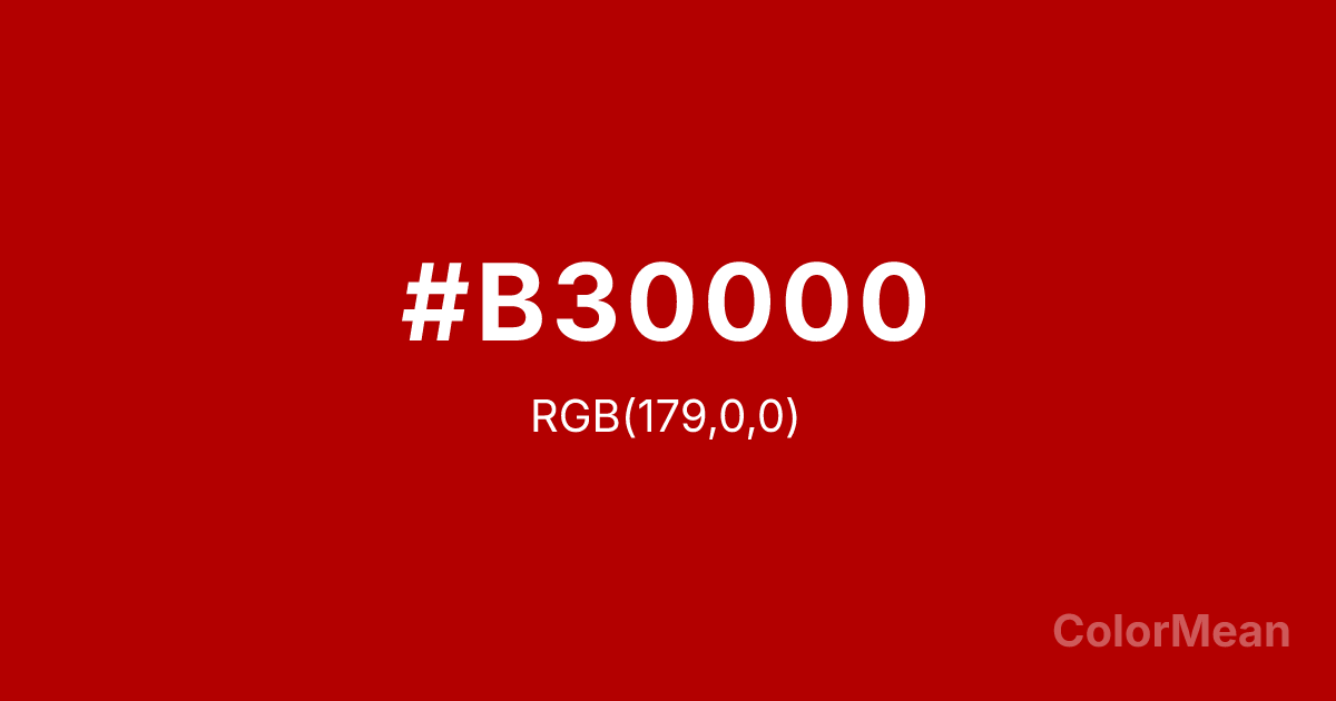 #B30000 RGB value is (179, 0, 0). The hex color red value is 179, green is 0, and blue is 0. Its HSL format shows a hue of 0°, saturation of 100 percent, and lightness of 35 percent. The CMYK process values are 0 percent, 100 percent, 100 percent, 30 percent.
