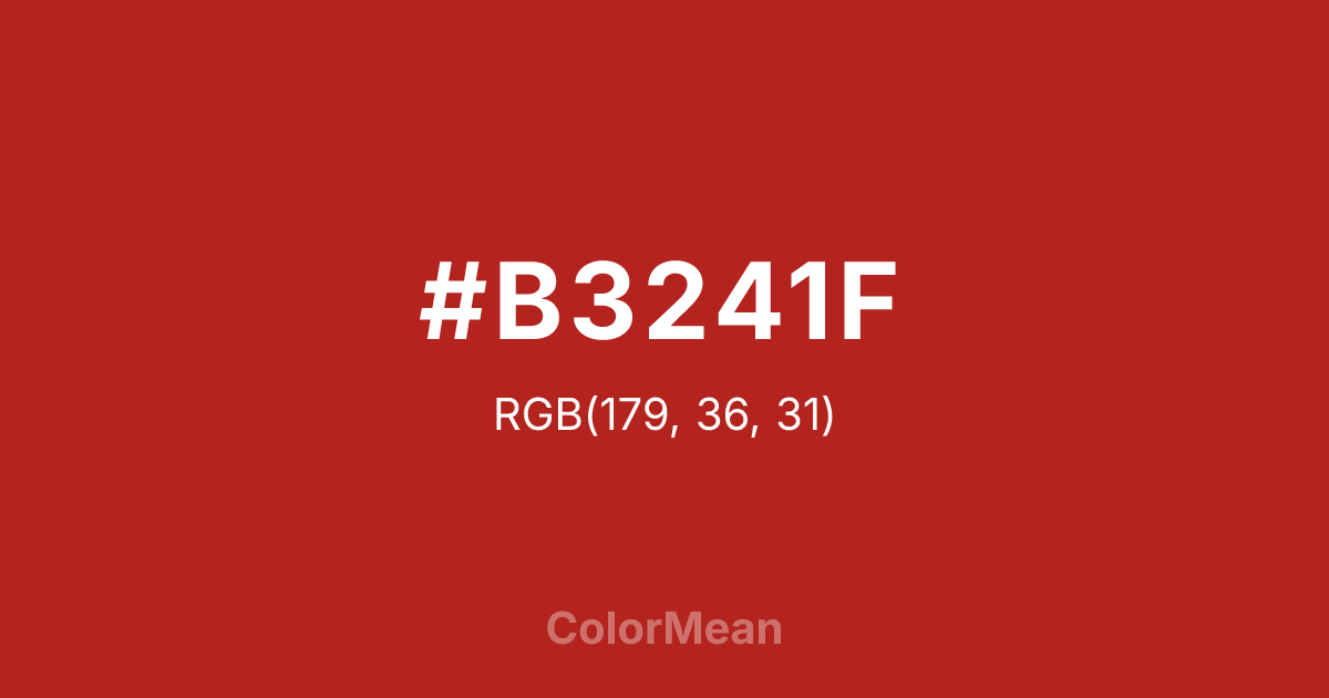 #B3241F RGB value is (179, 36, 31). The hex color red value is 179, green is 36, and blue is 31. Its HSL format shows a hue of 2°, saturation of 70 percent, and lightness of 41 percent. The CMYK process values are 0 percent, 80 percent, 83 percent, 30 percent.