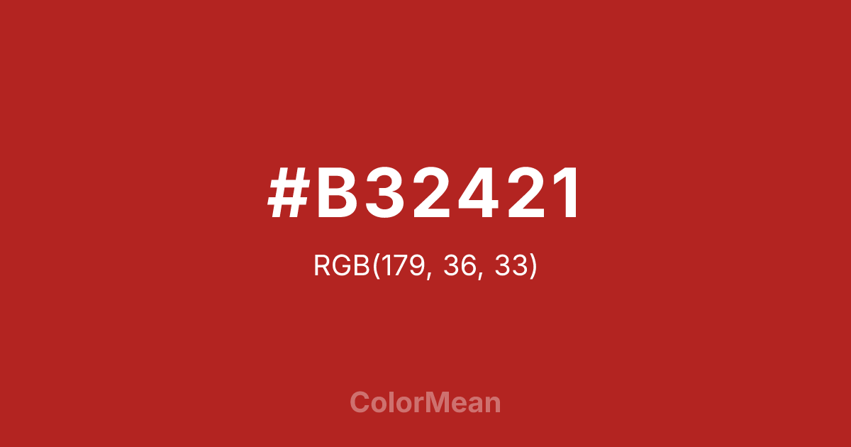 #B32421 RGB value is (179, 36, 33). The hex color red value is 179, green is 36, and blue is 33. Its HSL format shows a hue of 1°, saturation of 69 percent, and lightness of 42 percent. The CMYK process values are 0 percent, 80 percent, 82 percent, 30 percent.