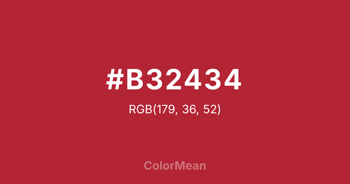 #B32434 RGB value is (179, 36, 52). The hex color red value is 179, green is 36, and blue is 52. Its HSL format shows a hue of 353°, saturation of 67 percent, and lightness of 42 percent. The CMYK process values are 0 percent, 80 percent, 71 percent, 30 percent.