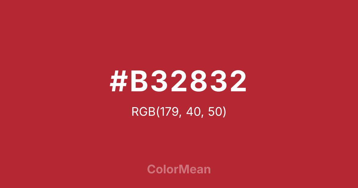#B32832 RGB value is (179, 40, 50). The hex color red value is 179, green is 40, and blue is 50. Its HSL format shows a hue of 356°, saturation of 63 percent, and lightness of 43 percent. The CMYK process values are 0 percent, 78 percent, 72 percent, 30 percent.