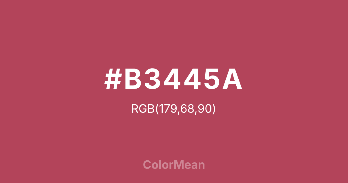 #B3445A RGB value is (179, 68, 90). The hex color red value is 179, green is 68, and blue is 90. Its HSL format shows a hue of 348°, saturation of 45 percent, and lightness of 48 percent. The CMYK process values are 0 percent, 62 percent, 50 percent, 30 percent.