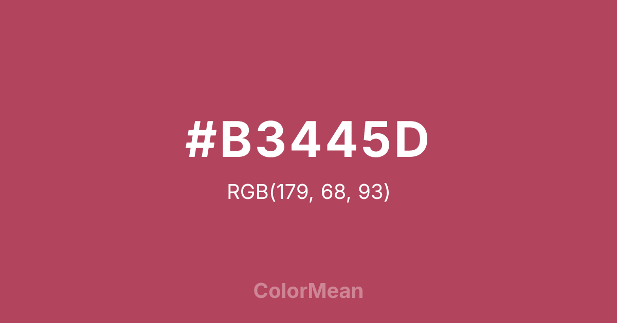 #B3445D RGB value is (179, 68, 93). The hex color red value is 179, green is 68, and blue is 93. Its HSL format shows a hue of 346°, saturation of 45 percent, and lightness of 48 percent. The CMYK process values are 0 percent, 62 percent, 48 percent, 30 percent.