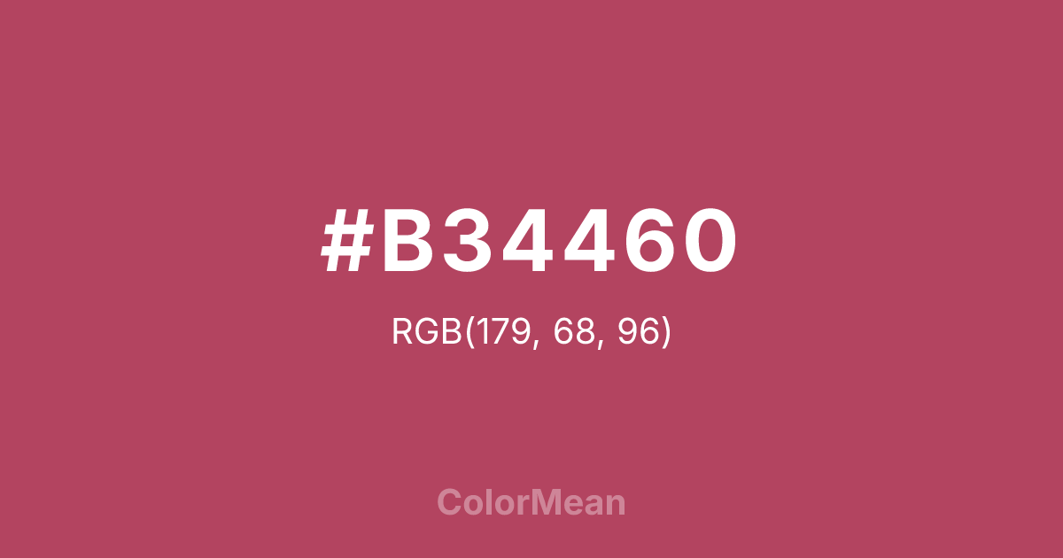 #B34460 RGB value is (179, 68, 96). The hex color red value is 179, green is 68, and blue is 96. Its HSL format shows a hue of 345°, saturation of 45 percent, and lightness of 48 percent. The CMYK process values are 0 percent, 62 percent, 46 percent, 30 percent.