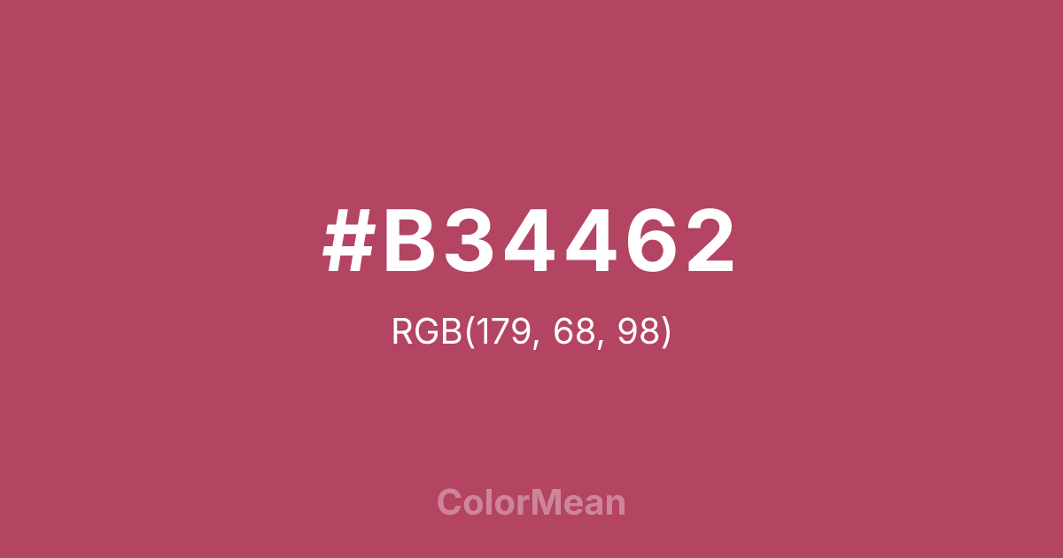 #B34462 RGB value is (179, 68, 98). The hex color red value is 179, green is 68, and blue is 98. Its HSL format shows a hue of 344°, saturation of 45 percent, and lightness of 48 percent. The CMYK process values are 0 percent, 62 percent, 45 percent, 30 percent.