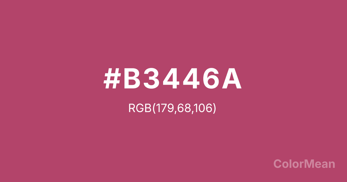 #B3446A RGB value is (179, 68, 106). The hex color red value is 179, green is 68, and blue is 106. Its HSL format shows a hue of 339°, saturation of 45 percent, and lightness of 48 percent. The CMYK process values are 0 percent, 62 percent, 41 percent, 30 percent.