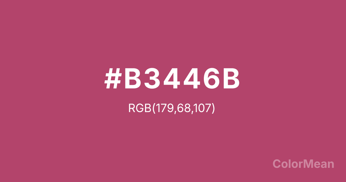 #B3446B RGB value is (179, 68, 107). The hex color red value is 179, green is 68, and blue is 107. Its HSL format shows a hue of 339°, saturation of 45 percent, and lightness of 48 percent. The CMYK process values are 0 percent, 62 percent, 40 percent, 30 percent.