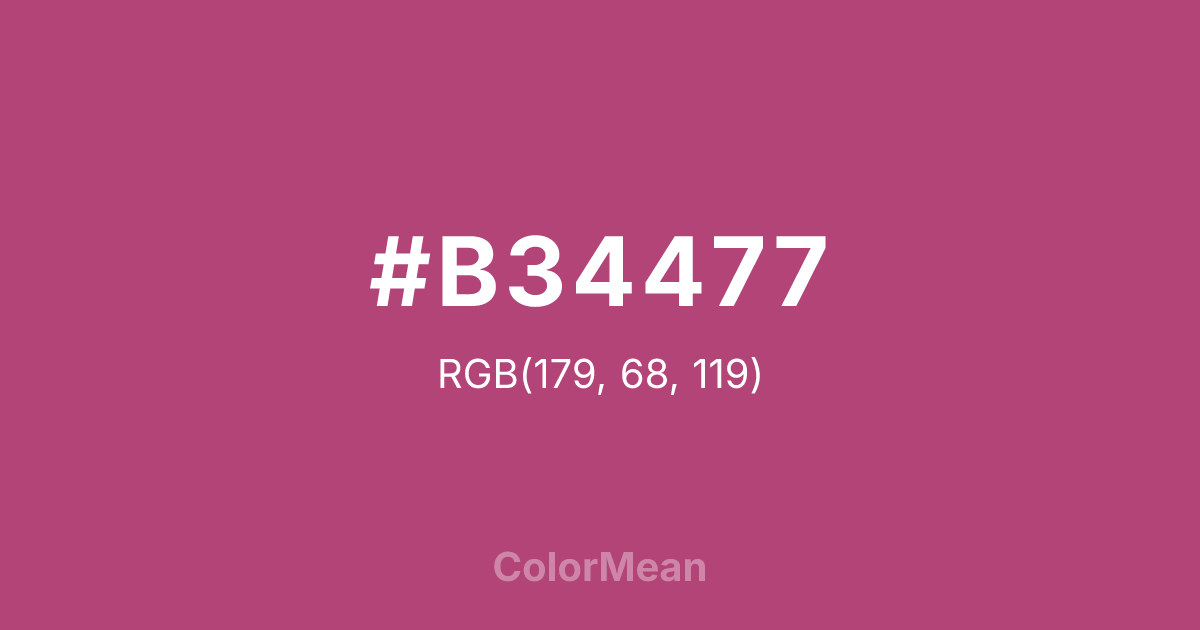 #B34477 RGB value is (179, 68, 119). The hex color red value is 179, green is 68, and blue is 119. Its HSL format shows a hue of 332°, saturation of 45 percent, and lightness of 48 percent. The CMYK process values are 0 percent, 62 percent, 34 percent, 30 percent.
