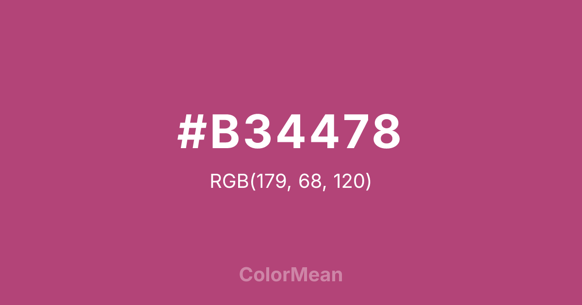 #B34478 RGB value is (179, 68, 120). The hex color red value is 179, green is 68, and blue is 120. Its HSL format shows a hue of 332°, saturation of 45 percent, and lightness of 48 percent. The CMYK process values are 0 percent, 62 percent, 33 percent, 30 percent.