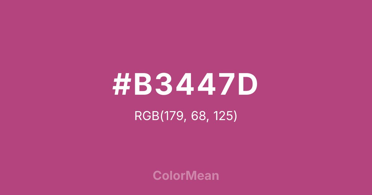 #B3447D RGB value is (179, 68, 125). The hex color red value is 179, green is 68, and blue is 125. Its HSL format shows a hue of 329°, saturation of 45 percent, and lightness of 48 percent. The CMYK process values are 0 percent, 62 percent, 30 percent, 30 percent.