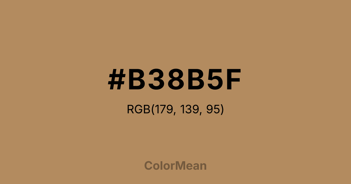 #B38B5F RGB value is (179, 139, 95). The hex color red value is 179, green is 139, and blue is 95. Its HSL format shows a hue of 31°, saturation of 36 percent, and lightness of 54 percent. The CMYK process values are 0 percent, 22 percent, 47 percent, 30 percent.