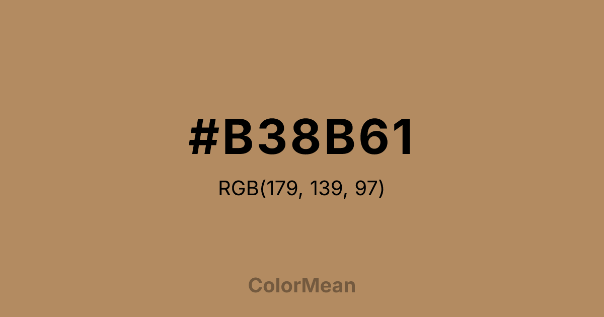 #B38B61 RGB value is (179, 139, 97). The hex color red value is 179, green is 139, and blue is 97. Its HSL format shows a hue of 31°, saturation of 35 percent, and lightness of 54 percent. The CMYK process values are 0 percent, 22 percent, 46 percent, 30 percent.