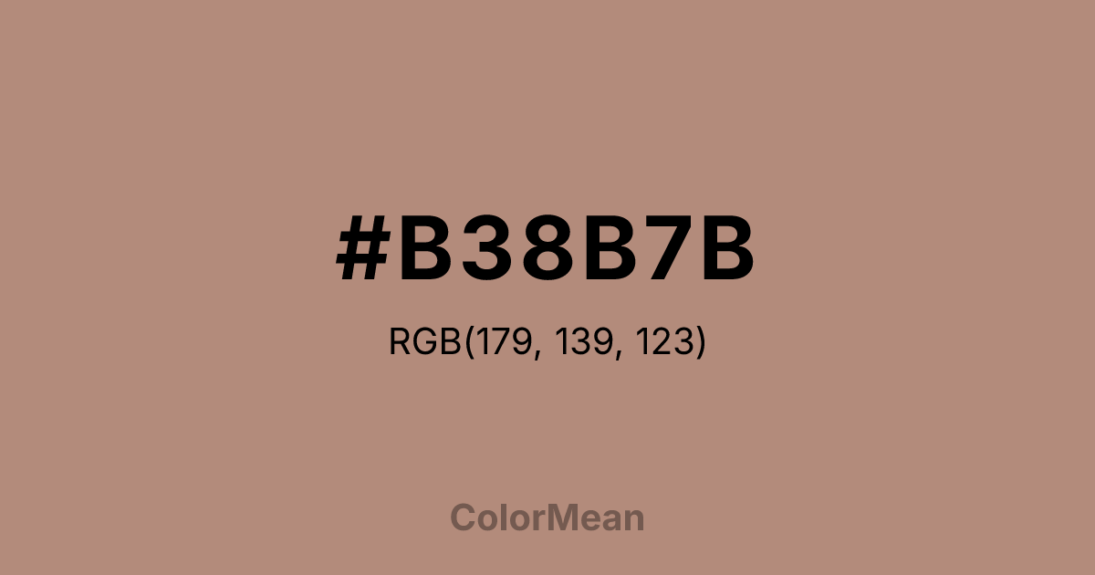 #B38B7B RGB value is (179, 139, 123). The hex color red value is 179, green is 139, and blue is 123. Its HSL format shows a hue of 17°, saturation of 27 percent, and lightness of 59 percent. The CMYK process values are 0 percent, 22 percent, 31 percent, 30 percent.