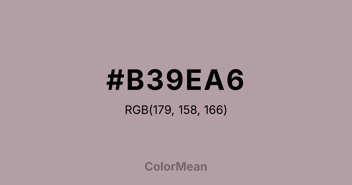#B39EA6 RGB value is (179, 158, 166). The hex color red value is 179, green is 158, and blue is 166. Its HSL format shows a hue of 337°, saturation of 12 percent, and lightness of 66 percent. The CMYK process values are 0 percent, 12 percent, 7 percent, 30 percent.