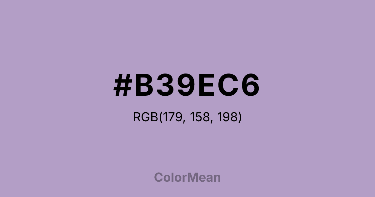 #B39EC6 RGB value is (179, 158, 198). The hex color red value is 179, green is 158, and blue is 198. Its HSL format shows a hue of 271°, saturation of 26 percent, and lightness of 70 percent. The CMYK process values are 10 percent, 20 percent, 0 percent, 22 percent.