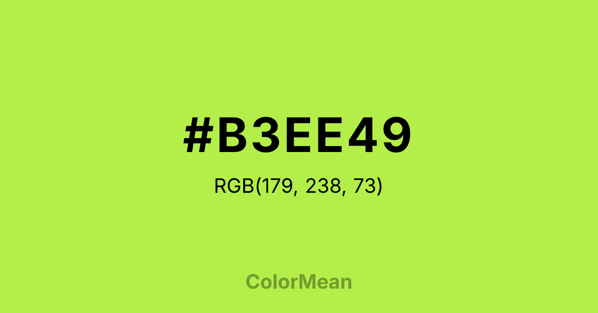 #B3EE49 RGB value is (179, 238, 73). The hex color red value is 179, green is 238, and blue is 73. Its HSL format shows a hue of 81°, saturation of 83 percent, and lightness of 61 percent. The CMYK process values are 25 percent, 0 percent, 69 percent, 7 percent.