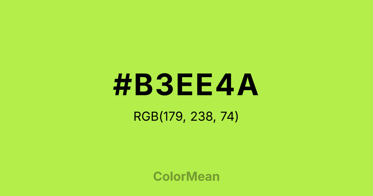 #B3EE4A RGB value is (179, 238, 74). The hex color red value is 179, green is 238, and blue is 74. Its HSL format shows a hue of 82°, saturation of 83 percent, and lightness of 61 percent. The CMYK process values are 25 percent, 0 percent, 69 percent, 7 percent.