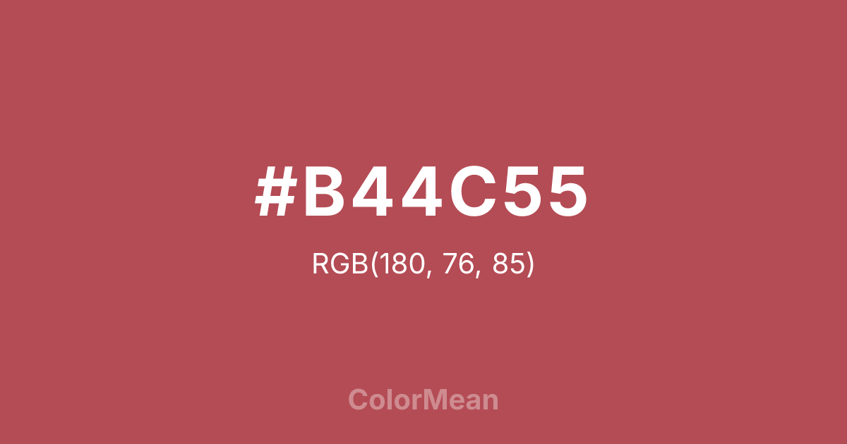 #B44C55 RGB value is (180, 76, 85). The hex color red value is 180, green is 76, and blue is 85. Its HSL format shows a hue of 355°, saturation of 41 percent, and lightness of 50 percent. The CMYK process values are 0 percent, 58 percent, 53 percent, 29 percent.
