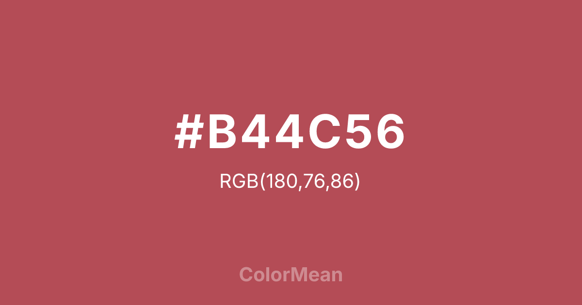 #B44C56 RGB value is (180, 76, 86). The hex color red value is 180, green is 76, and blue is 86. Its HSL format shows a hue of 354°, saturation of 41 percent, and lightness of 50 percent. The CMYK process values are 0 percent, 58 percent, 52 percent, 29 percent.