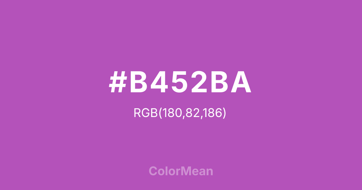 #B452BA RGB value is (180, 82, 186). The hex color red value is 180, green is 82, and blue is 186. Its HSL format shows a hue of 297°, saturation of 43 percent, and lightness of 53 percent. The CMYK process values are 3 percent, 56 percent, 0 percent, 27 percent.