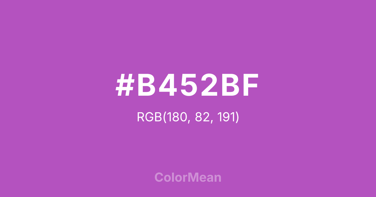 #B452BF RGB value is (180, 82, 191). The hex color red value is 180, green is 82, and blue is 191. Its HSL format shows a hue of 294°, saturation of 46 percent, and lightness of 54 percent. The CMYK process values are 6 percent, 57 percent, 0 percent, 25 percent.