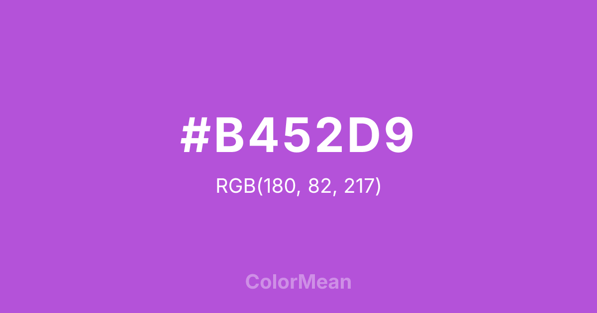 #B452D9 RGB value is (180, 82, 217). The hex color red value is 180, green is 82, and blue is 217. Its HSL format shows a hue of 284°, saturation of 64 percent, and lightness of 59 percent. The CMYK process values are 17 percent, 62 percent, 0 percent, 15 percent.
