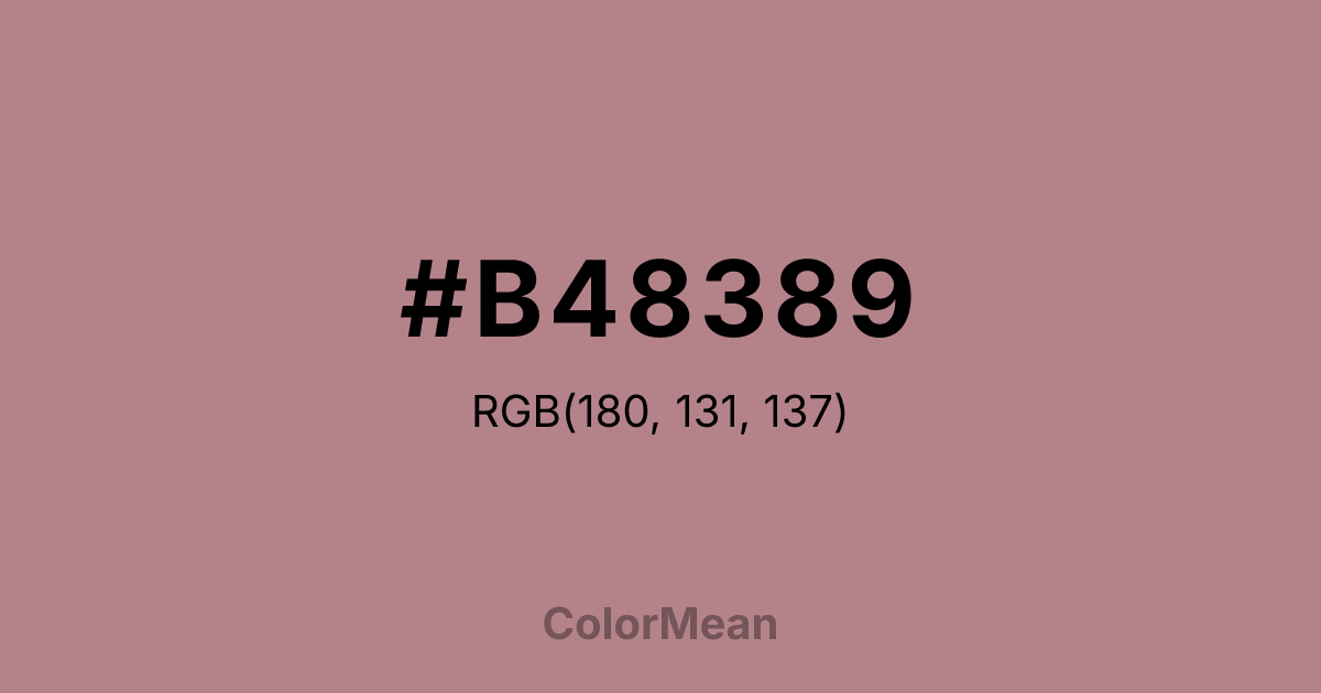 #B48389 RGB value is (180, 131, 137). The hex color red value is 180, green is 131, and blue is 137. Its HSL format shows a hue of 353°, saturation of 25 percent, and lightness of 61 percent. The CMYK process values are 0 percent, 27 percent, 24 percent, 29 percent.