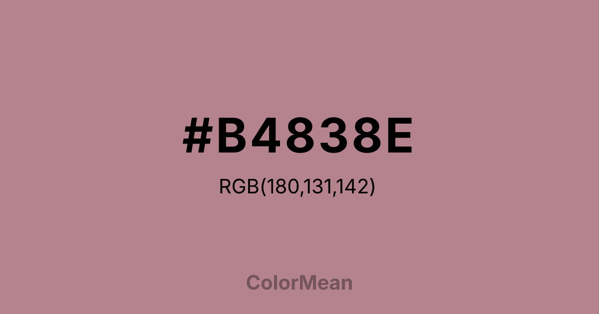 #B4838E RGB value is (180, 131, 142). The hex color red value is 180, green is 131, and blue is 142. Its HSL format shows a hue of 347°, saturation of 25 percent, and lightness of 61 percent. The CMYK process values are 0 percent, 27 percent, 21 percent, 29 percent.