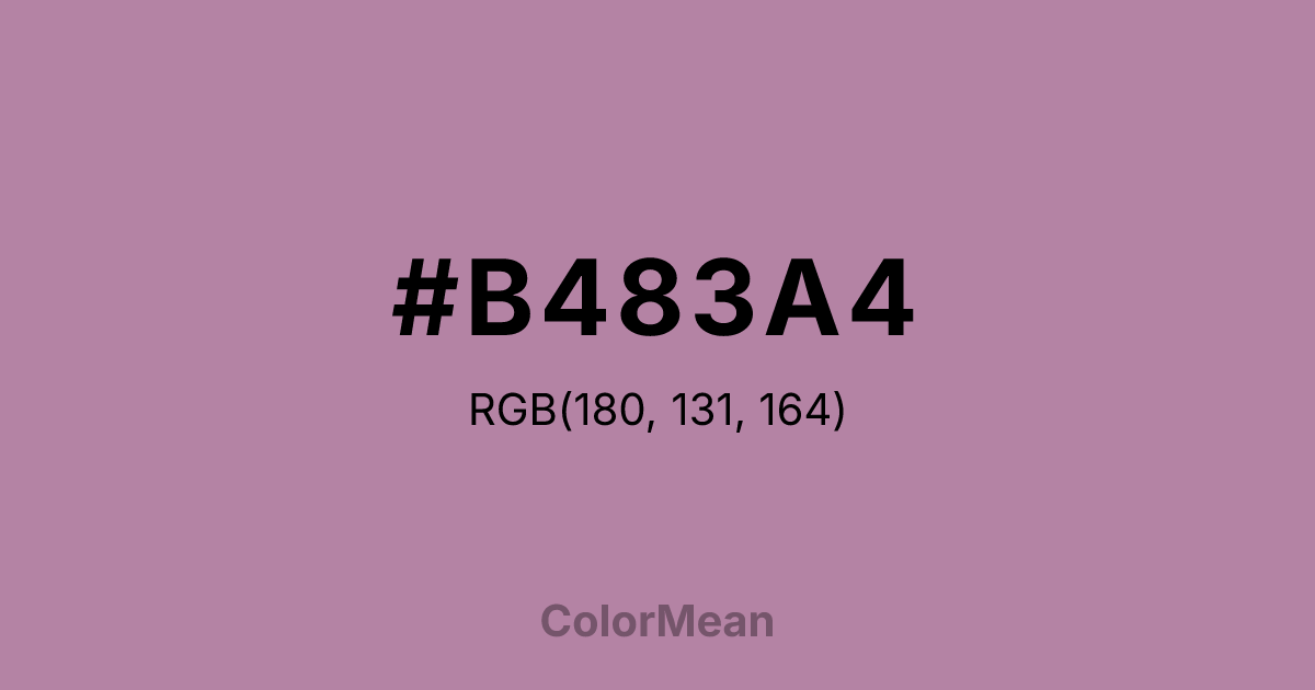 #B483A4 RGB value is (180, 131, 164). The hex color red value is 180, green is 131, and blue is 164. Its HSL format shows a hue of 320°, saturation of 25 percent, and lightness of 61 percent. The CMYK process values are 0 percent, 27 percent, 9 percent, 29 percent.