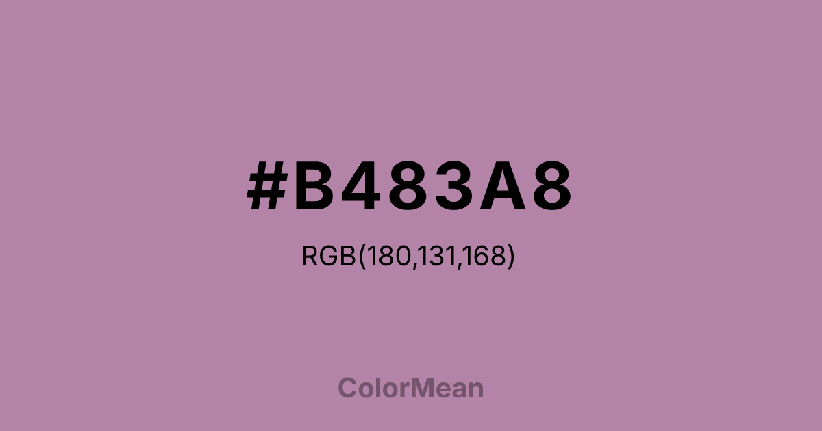 #B483A8 RGB value is (180, 131, 168). The hex color red value is 180, green is 131, and blue is 168. Its HSL format shows a hue of 315°, saturation of 25 percent, and lightness of 61 percent. The CMYK process values are 0 percent, 27 percent, 7 percent, 29 percent.