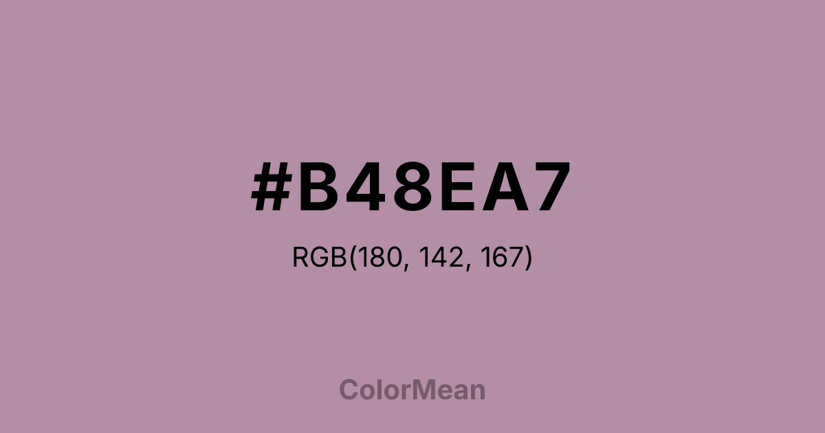 #B48EA7 RGB value is (180, 142, 167). The hex color red value is 180, green is 142, and blue is 167. Its HSL format shows a hue of 321°, saturation of 20 percent, and lightness of 63 percent. The CMYK process values are 0 percent, 21 percent, 7 percent, 29 percent.