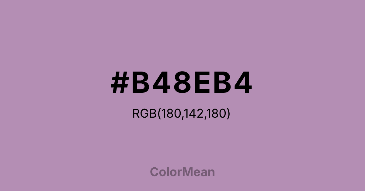 #B48EB4 RGB value is (180, 142, 180). The hex color red value is 180, green is 142, and blue is 180. Its HSL format shows a hue of 300°, saturation of 20 percent, and lightness of 63 percent. The CMYK process values are 0 percent, 21 percent, 0 percent, 29 percent.