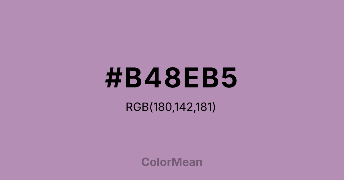 #B48EB5 RGB value is (180, 142, 181). The hex color red value is 180, green is 142, and blue is 181. Its HSL format shows a hue of 298°, saturation of 21 percent, and lightness of 63 percent. The CMYK process values are 1 percent, 22 percent, 0 percent, 29 percent.