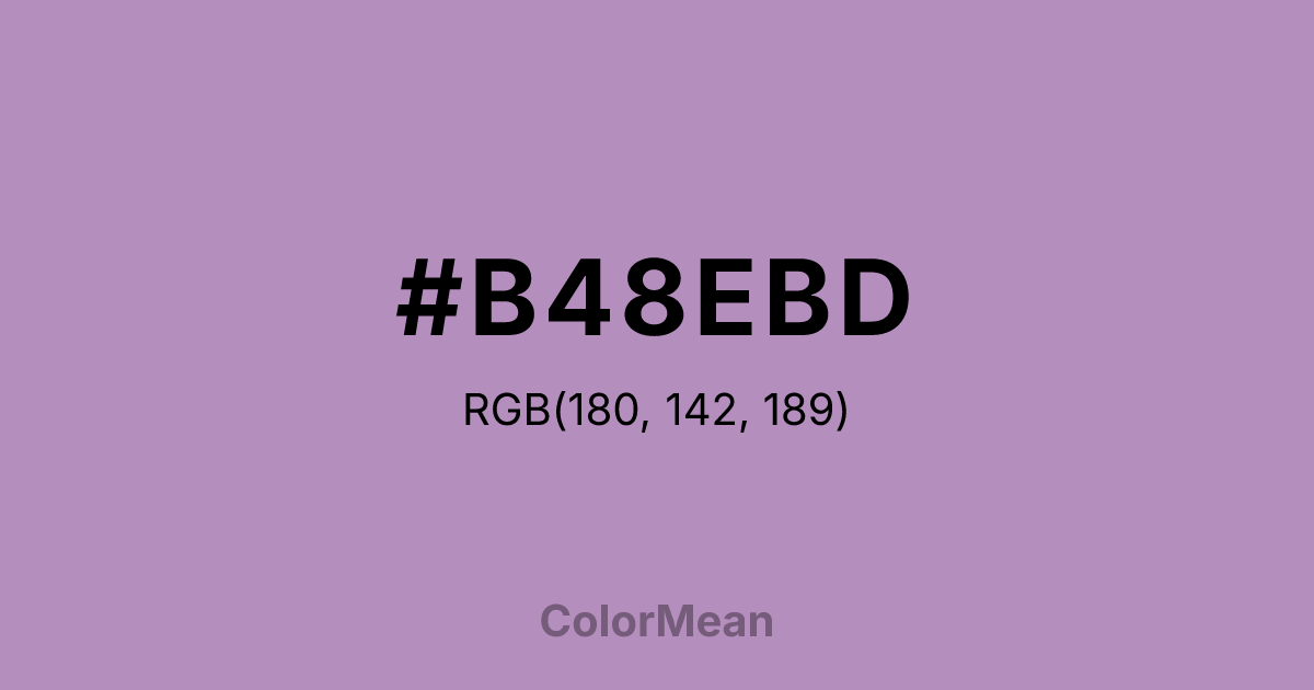 #B48EBD RGB value is (180, 142, 189). The hex color red value is 180, green is 142, and blue is 189. Its HSL format shows a hue of 289°, saturation of 26 percent, and lightness of 65 percent. The CMYK process values are 5 percent, 25 percent, 0 percent, 26 percent.
