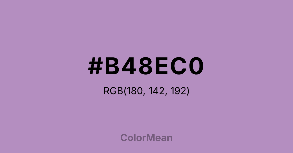 #B48EC0 RGB value is (180, 142, 192). The hex color red value is 180, green is 142, and blue is 192. Its HSL format shows a hue of 286°, saturation of 28 percent, and lightness of 65 percent. The CMYK process values are 6 percent, 26 percent, 0 percent, 25 percent.