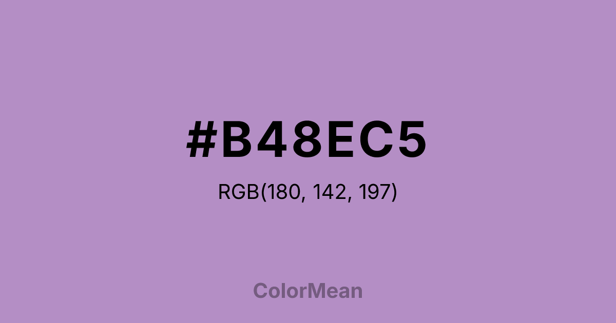 #B48EC5 RGB value is (180, 142, 197). The hex color red value is 180, green is 142, and blue is 197. Its HSL format shows a hue of 281°, saturation of 32 percent, and lightness of 66 percent. The CMYK process values are 9 percent, 28 percent, 0 percent, 23 percent.
