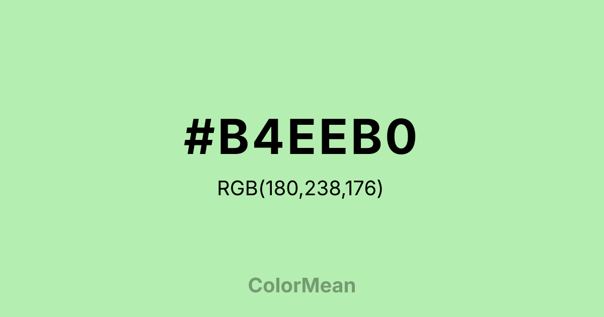 #B4EEB0 RGB value is (180, 238, 176). The hex color red value is 180, green is 238, and blue is 176. Its HSL format shows a hue of 116°, saturation of 65 percent, and lightness of 81 percent. The CMYK process values are 24 percent, 0 percent, 26 percent, 7 percent.