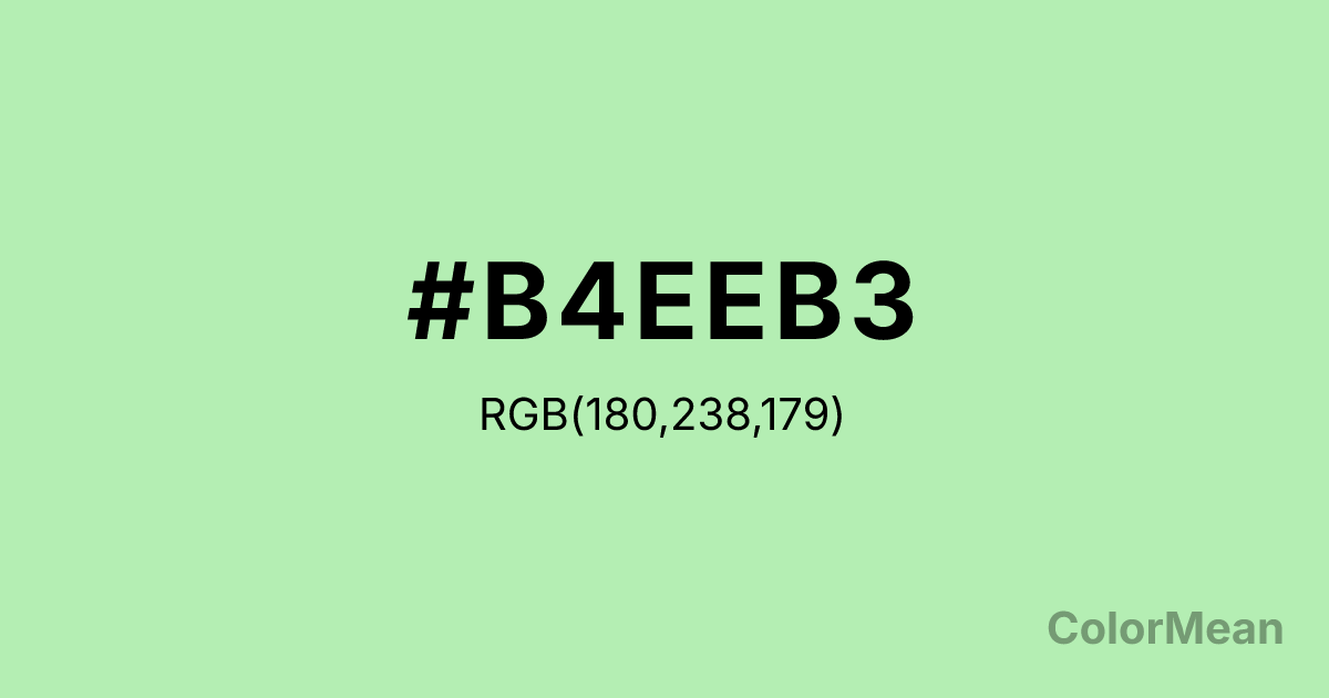 #B4EEB3 RGB value is (180, 238, 179). The hex color red value is 180, green is 238, and blue is 179. Its HSL format shows a hue of 119°, saturation of 63 percent, and lightness of 82 percent. The CMYK process values are 24 percent, 0 percent, 25 percent, 7 percent.