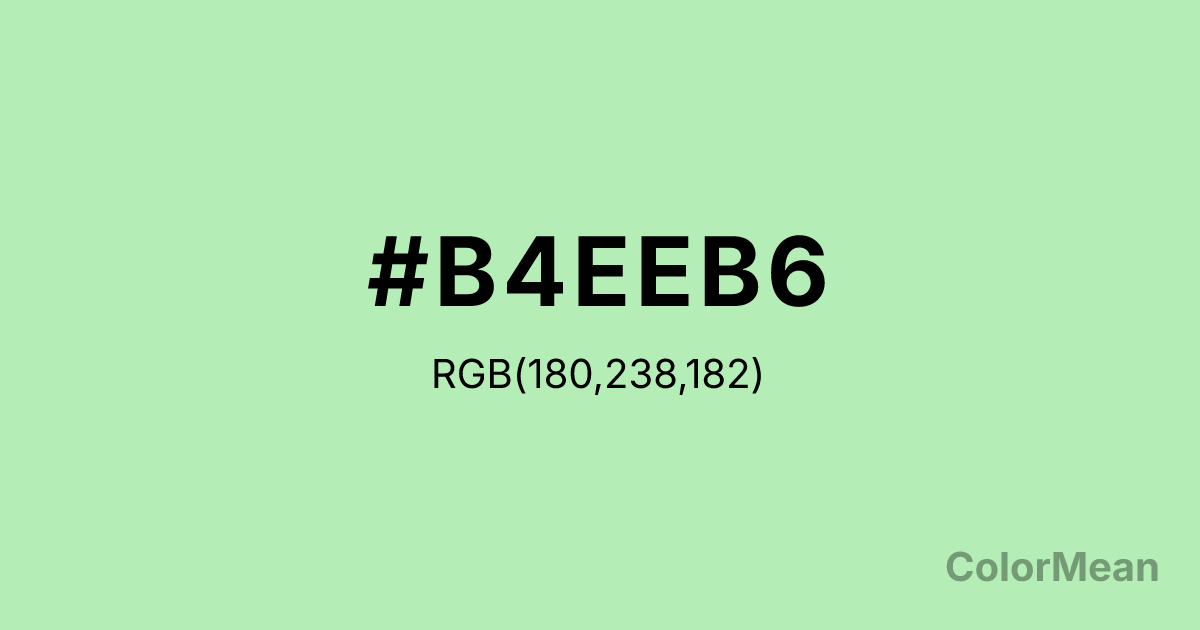 #B4EEB6 RGB value is (180, 238, 182). The hex color red value is 180, green is 238, and blue is 182. Its HSL format shows a hue of 122°, saturation of 63 percent, and lightness of 82 percent. The CMYK process values are 24 percent, 0 percent, 24 percent, 7 percent.