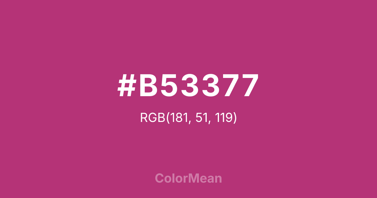 #B53377 RGB value is (181, 51, 119). The hex color red value is 181, green is 51, and blue is 119. Its HSL format shows a hue of 329°, saturation of 56 percent, and lightness of 45 percent. The CMYK process values are 0 percent, 72 percent, 34 percent, 29 percent.