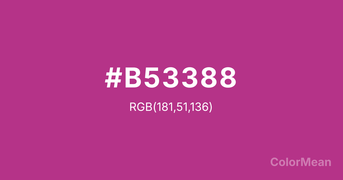 #B53388 RGB value is (181, 51, 136). The hex color red value is 181, green is 51, and blue is 136. Its HSL format shows a hue of 321°, saturation of 56 percent, and lightness of 45 percent. The CMYK process values are 0 percent, 72 percent, 25 percent, 29 percent.