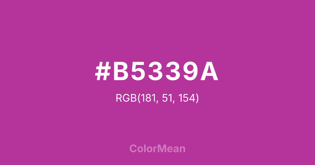 #B5339A RGB value is (181, 51, 154). The hex color red value is 181, green is 51, and blue is 154. Its HSL format shows a hue of 312°, saturation of 56 percent, and lightness of 45 percent. The CMYK process values are 0 percent, 72 percent, 15 percent, 29 percent.