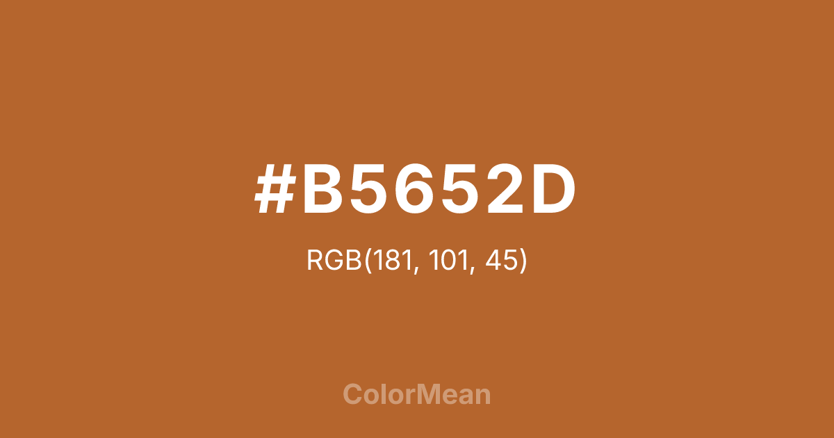 #B5652D RGB value is (181, 101, 45). The hex color red value is 181, green is 101, and blue is 45. Its HSL format shows a hue of 25°, saturation of 60 percent, and lightness of 44 percent. The CMYK process values are 0 percent, 44 percent, 75 percent, 29 percent.