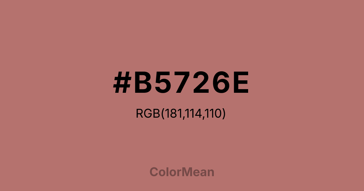 #B5726E RGB value is (181, 114, 110). The hex color red value is 181, green is 114, and blue is 110. Its HSL format shows a hue of 3°, saturation of 32 percent, and lightness of 57 percent. The CMYK process values are 0 percent, 37 percent, 39 percent, 29 percent.